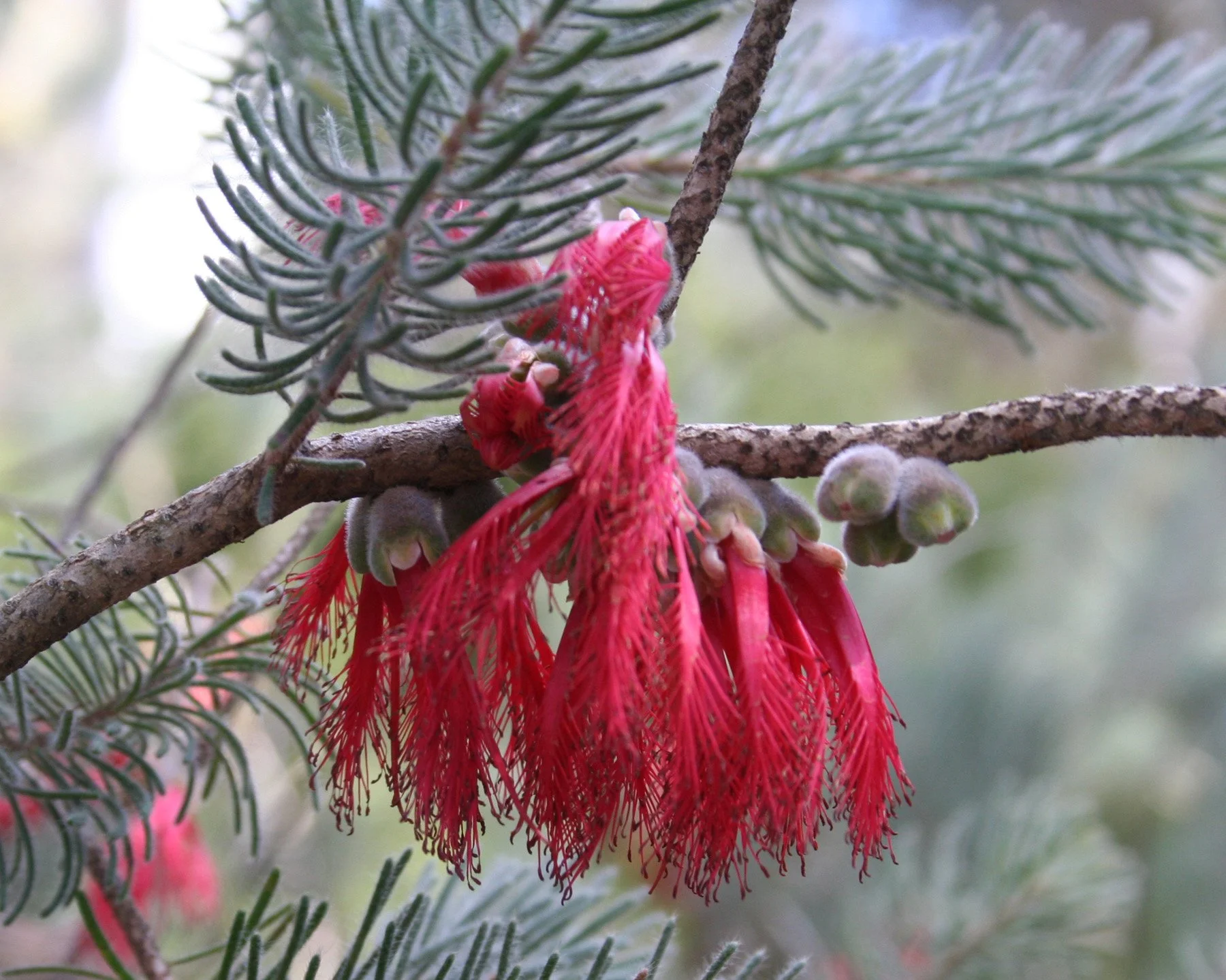 We planted ‘Lighthouse’, an upright selection of A. cunninghamii, 1.5m high x 1m wide, with silver grey foliage and red ‘jug’ flowers, in November 2008. This plant blooms reliably at the end of each year and the tiny flowers are loved by insects and birds.