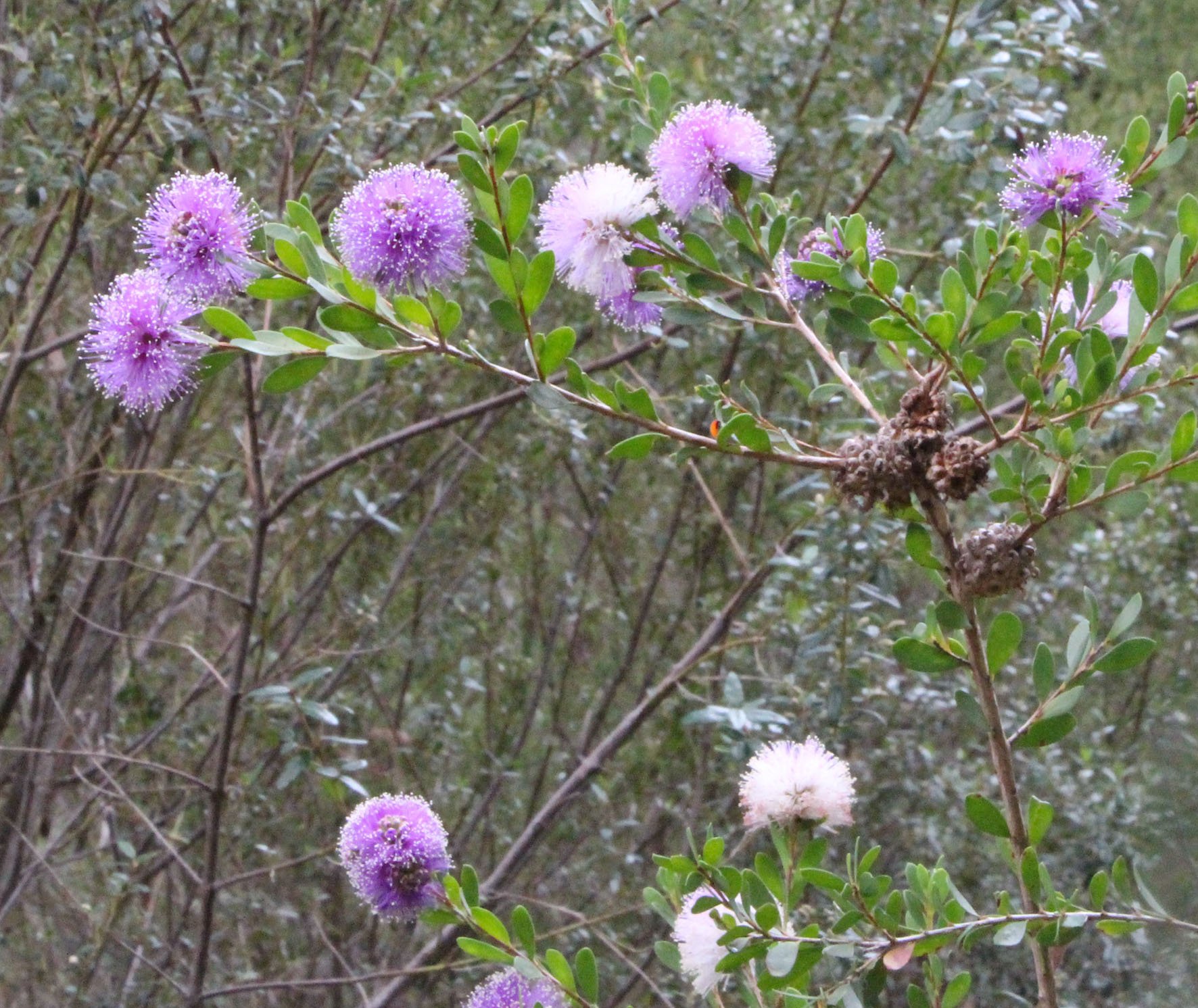 Melaleuca diosmatifolia is a shrub to 2m high and wide, but our plant has grown much taller, perhaps 3.5m high with linear dark green leaves and small mauve flower spikes. This plant is native from the Sydney area north to southeastern Queensland.