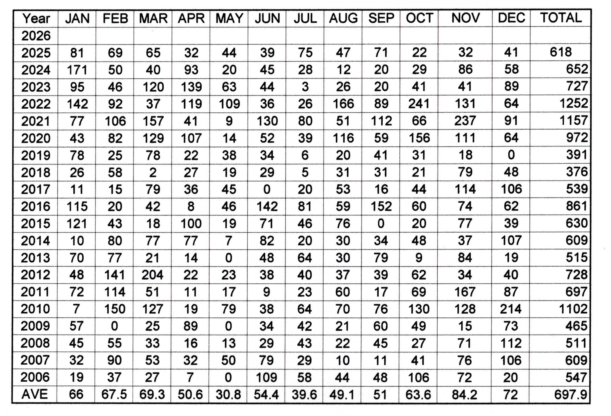 Rainfall in our garden is very variable. For several months of the year we can have no rainfall at all, or very low rainfall. The highest total for one month so far is 237mm in November 2021, a La Nina year. The total rainfall for one year has varied from 376mm in 2018 to 1157mm in 2021, a La Nina year, a factor of three times difference. On average the month of lowest rainfall is May and highest is November.